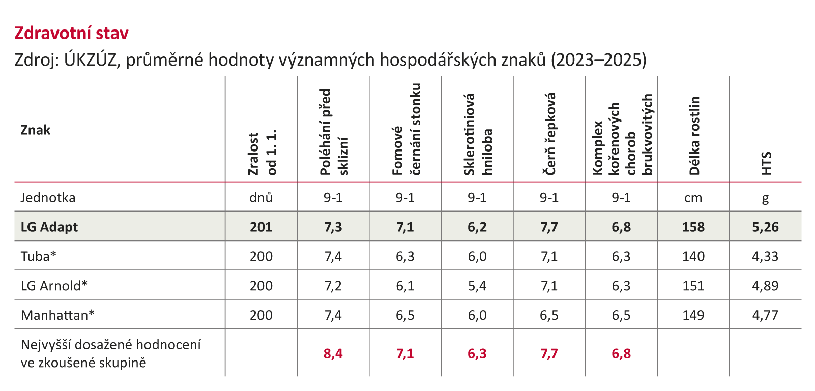Vysoký výnos hybridu LG Adapt je ve shodě s nově přicházející genetikou od společnosti Limagrain podpořen odolností vůči verticíliovému vadnutí (Verticillium dahliae). Tato vlastnost je nesena polygenně. V DNA je také standardní výbava - odolnost fómové hnilobě (Phoma lingam), za kterou je zodpovědná velká skupina genů vč. majorgenu Rlm7.