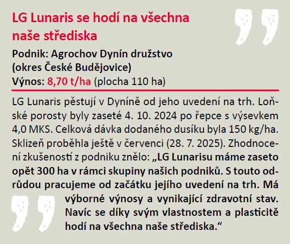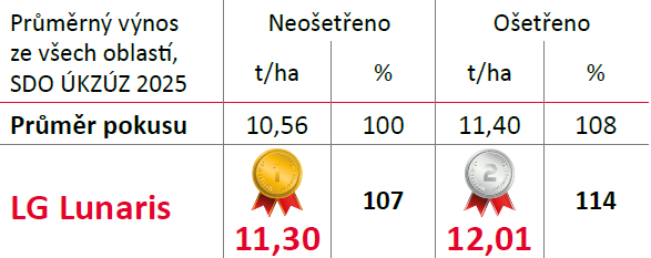 LG Lunaris je krmná odrůda se špičkovým výnosem zrna a se špičkovým zdravotním stavem listové plochy. V metání se jedná o polopozdní odrůdu, která díky výbornému zdravotnímu stavu a dlouhé periodě plnění zrna dozrává s pozdními odrůdami. Je vhodná do všech výrobních oblastí. Vyniká plasticitou a stabilitou výnosu, který tvoří vysokou produktivitou klasu (vysoký počet zrn v klase při střední HTZ) – klasová odrůda. Optimální hustota porostu je 500–600 klasů/m2. Rostliny jsou středně vysoké (90–95 cm) a stéblo vyniká vysokou pevností a vysokou odolností proti poléhání. LG Lunaris je vhodný i pro extenzivní pěstování nebo pro systém jednoho ošetření fungicidem na praporcový list nebo klas – při běžných podmínkách dovolují vlastnosti odrůdy úplně vynechat první ošetření (fungicidem i regulátorem). Odrůda je vhodná pro setí po obilnině a pro pozdní setí. Při setí po kukuřici se doporučuje vhodné ošetření klasovým fungicidem.