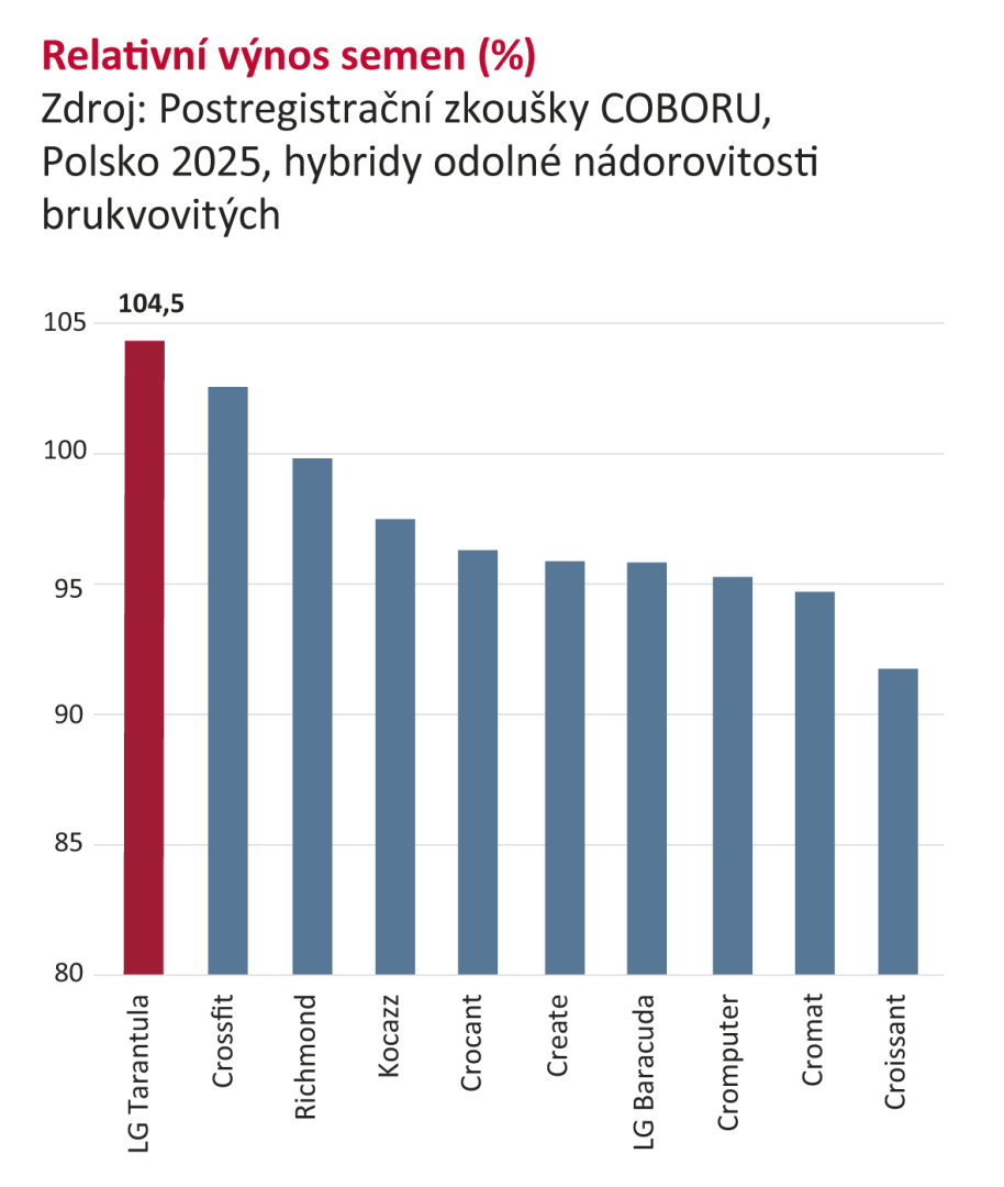 LG Tarantula je nový středně raný robustní hybrid s odolností vůči nádorovitosti brukvovitých. Termín setí je vhodné přizpůsobit středně rychlému podzimnímu vývoji. Jarní nástup do vegetace je pozvolný, do kvetení spíše pozdní, uniká pozdním jarním mrazíkům, hybrid lze pěstovat v mrazových kotlinách. U hybridu LG Tarantula je třeba provést úplné ošetření proti hlízence. Termínem sklizně navazuje na raný LG Scorpion.