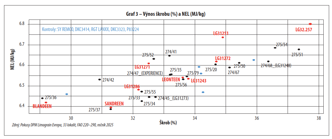 Mimořádnou výkonnost hybridu LG 32.257 v silážní kvalitě i produkci zrna dokreslují rozsáhlé pokusy německých postregistračních zkoušek LSV v letech 2020–2025. Výsledky ze všech lokalit v Dolním Sasku vynesly hybrid k nadprůměrným hodnotám obsahu škrobu až 107 % a netto energie laktace 6,8 MJ NEL/kg sušiny. Z výpočtů Limagrainu v evropských registračních řízeních v letech 2020–2022 je hybrid LG 32.257 FAO 250 schopen vyprodukovat v průměru 28 251 kg mléka z hektaru. Znovu podtrhuji: adekvátně ročníkům 2020–2022! Základem výpočtu LGAN Milk+ je americký systém hodnocení kvality krmiva Milk2006 (University of Wisconsin, Shaver et al. 2003, revision 2006). Pokud se i nadále budeme ohlížet na výsledky za našimi západními hranicemi v Dolním Sasku a Bavorsku, najdeme hybrid LG 32.257 i v nejvyšších pozicích v grafech popisujících výnos zrna (graf 1 a 2). Německé robustní výsledky LSV v obsahu škrobu a NEL korelovaly i s pokusy společnosti Limagrain. Graf 3 přináší průměrné hodnoty z 33 evropských lokalit ve skupině hybridů FAO 220–290. Nutriční kvalita hybridu LG 32.257 je mimořádná. Pěstitelé ani chovatelé v obilnářské a řepařské výrobní oblasti nemusejí s hybridem LG 32.257 dělat kompromis. Při přebytkovém výnosu kvalitní siláže poskytne LG 32.257 i nadstandardní výnos vlhkého či suchého zrna.