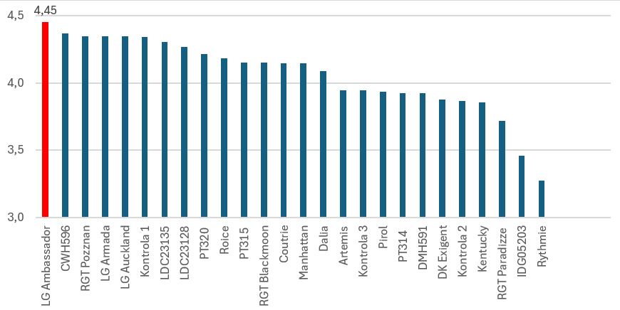 LG Ambassador je středně raný OGU/INRA hybrid se stabilně vysokými výnosy v širokém spektru klimatických oblastí, aktuální data ÚKZÚZ za roky 2023-2025 popisují výkon v teplé oblasti – 107 % a v chladné oblasti – 103 % na průměr zkoušených odrůd. Zvládá rozdílná půdní prostředí, od úrodných nížin po kamenité polohy, kde často rozhoduje jen vitalita porostu. Obecně lépe snáší sucho než dlouhodobé mokro. O vynikajících výnosech v teplých pěstitelských oblastech vypovídají také čerstvé výsledky Farmářské unie IKR v Maďarsku (graf 1). Rychlý podzimní růst, pevné zdraví, výborné přezimování a silná kompenzační schopnost zajišťují, že LG Ambassador dokáže podat výkon i tam, kde jiné hybridy selhávají. O tom se pěstitelé přesvědčují každoročně vӍcelé Evropě. Bez nadsázky můžeme říct, že mají více než 1 500 000 ha zkušeností.